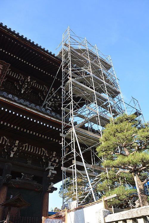 2018年の台風で、仁王門の瓦屋根が飛んで修繕工事中の寺院(京都市)。写真=鵜飼秀徳