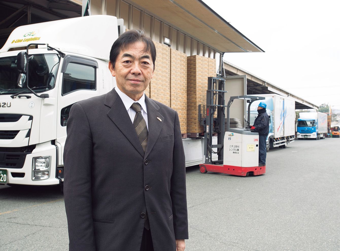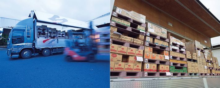 福岡市内の営業所(写真左)。同社のトラックの荷台には競合食品メーカーの製品が“呉越同舟”(同右)。「誰もやったことがないことを、やる。誰かがもうやったことを始めても意味がない」(妹尾氏)。