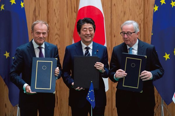 日欧EPA署名式を終えたEUのトゥスク大統領(左)、安倍首相、ユンケル欧州委員長(2018年7月)。(AFLO=写真)