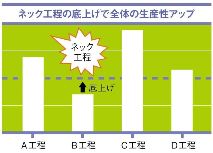 全体の生産性は、問題が頻発するネック工程の生産性に引き下げられてしまう。ネック工程の改善は、全体の生産性の改善に直結するのだ。また、ネック工程を改善すれば、新たなネック工程が見つかるもの。改善には終わりがないと考え、取り組みたい。
