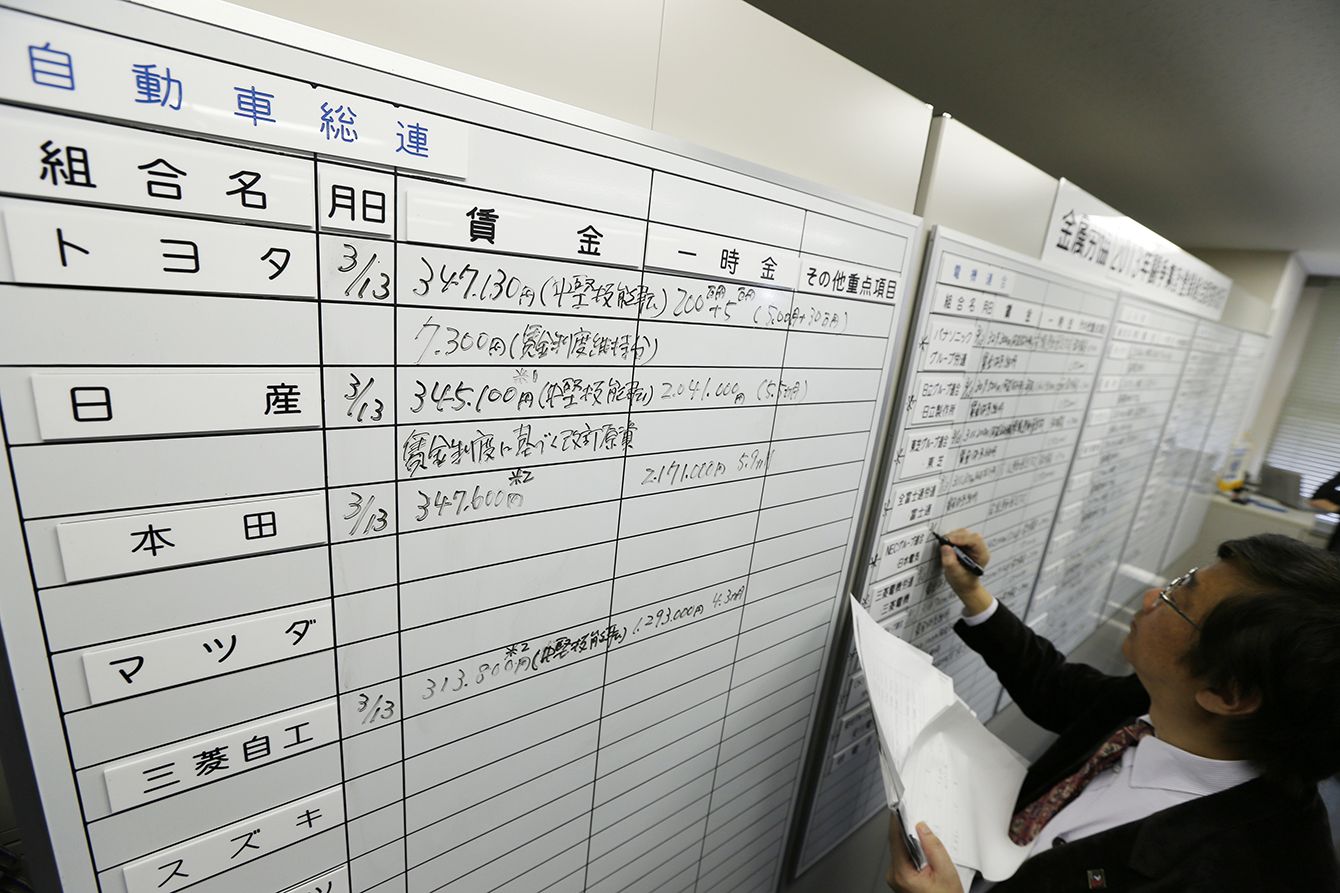 春闘といえば生活向上のためのベア(ベースアップ)を巡る攻防だったが、今やべアに対するこだわりも薄くなっているようにみえる。写真は春闘集中回答日でボードに書き込まれる各社の回答額=2013年3月13日午前、東京・日本橋の金属労協(写真=時事通信フォト)