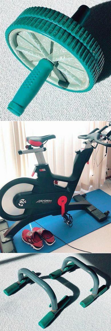 澤田社長が自宅で愛用するトレーニング用品の数々。上から腹筋ローラー、フィットネスバイク、腕立て伏せ用のプッシュアップバー。筋肉質でスリムな体型を維持し、休日にはトライアスロンの大会に出場するほどのバリバリの肉体派だ。