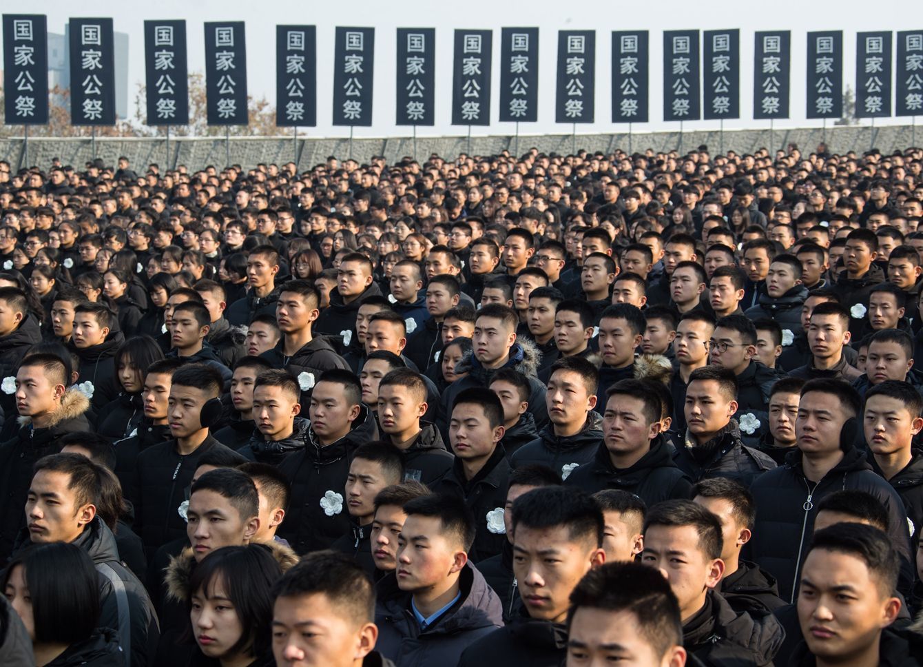 2018年12月、南京事件追悼式典に参列した大勢の兵士や警官、一般市民。(写真=Imaginechina/時事通信フォト)