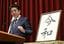 新元号「令和(れいわ)」の書を傍らに、記者会見する安倍晋三首相=2019年4月1日、首相官邸(写真=時事通信フォト)