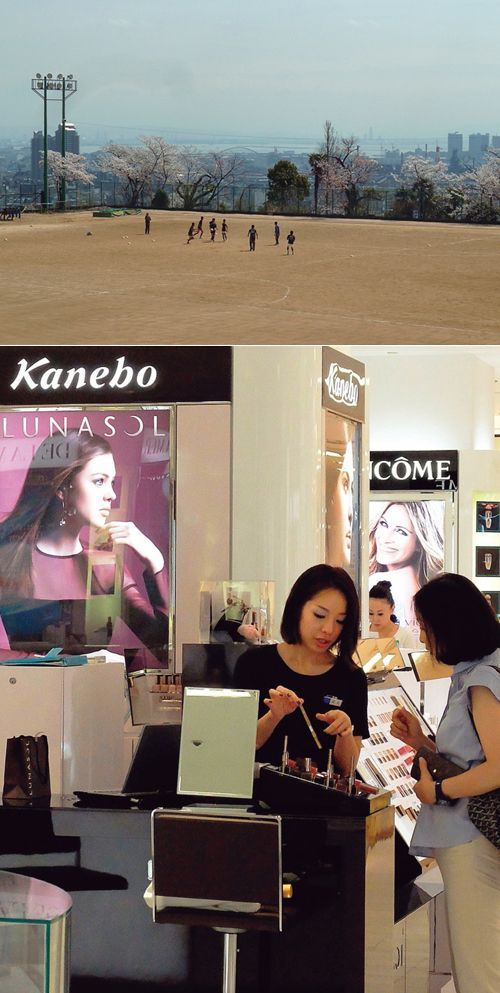 カネボウ化粧品社長時代に「自分の背中を押すために」訪れたという、母校・神戸高校のグラウンド(写真上)とカネボウの化粧品売り場(同下)。知識氏にとってはそれが「心が落ち着く場所、清らかになれる場所」であった。(AFP/時事、兵庫県立神戸高等学校=写真)