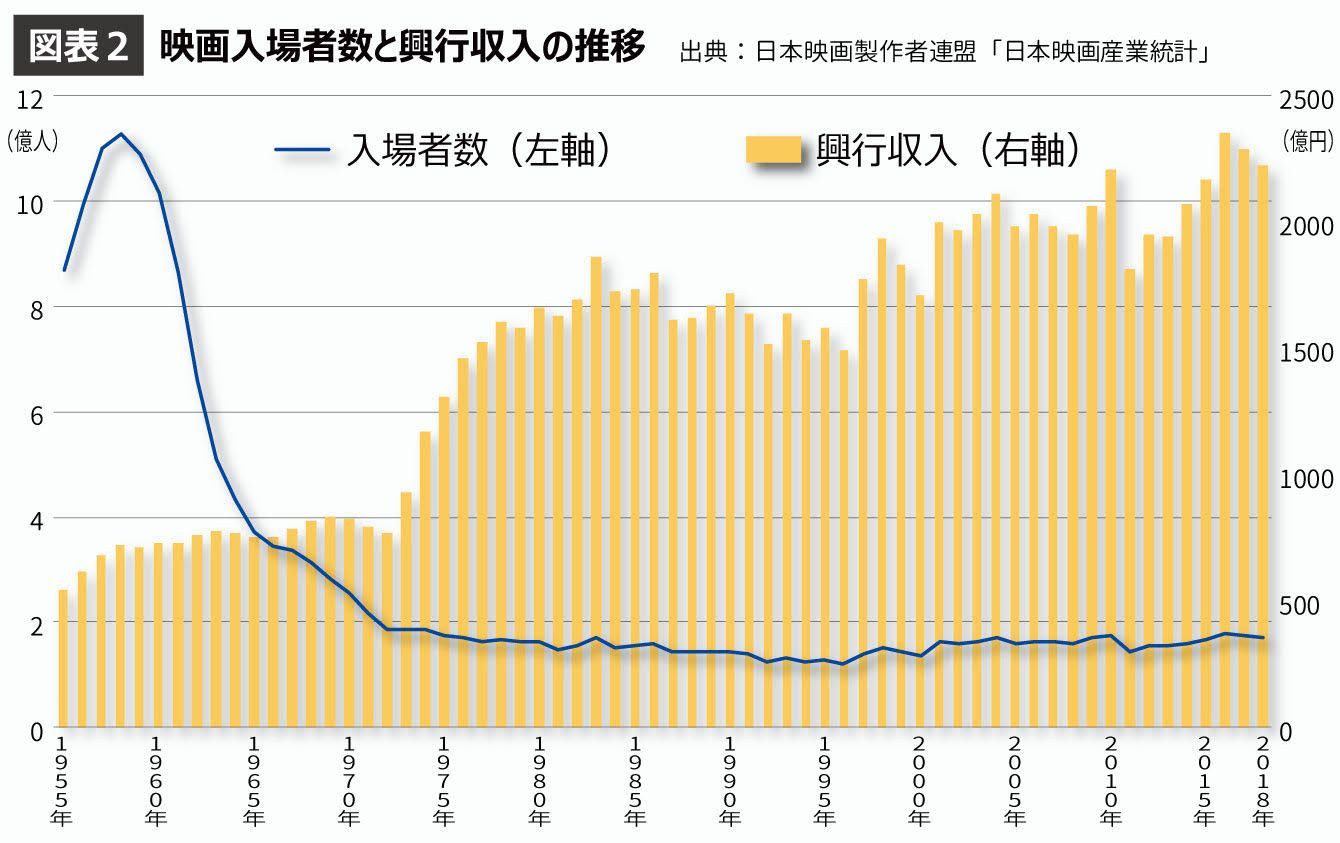 (図表3)北米(アメリカとカナダ)の映画入場者数と興行収入の推移(画像=松谷創一郎)