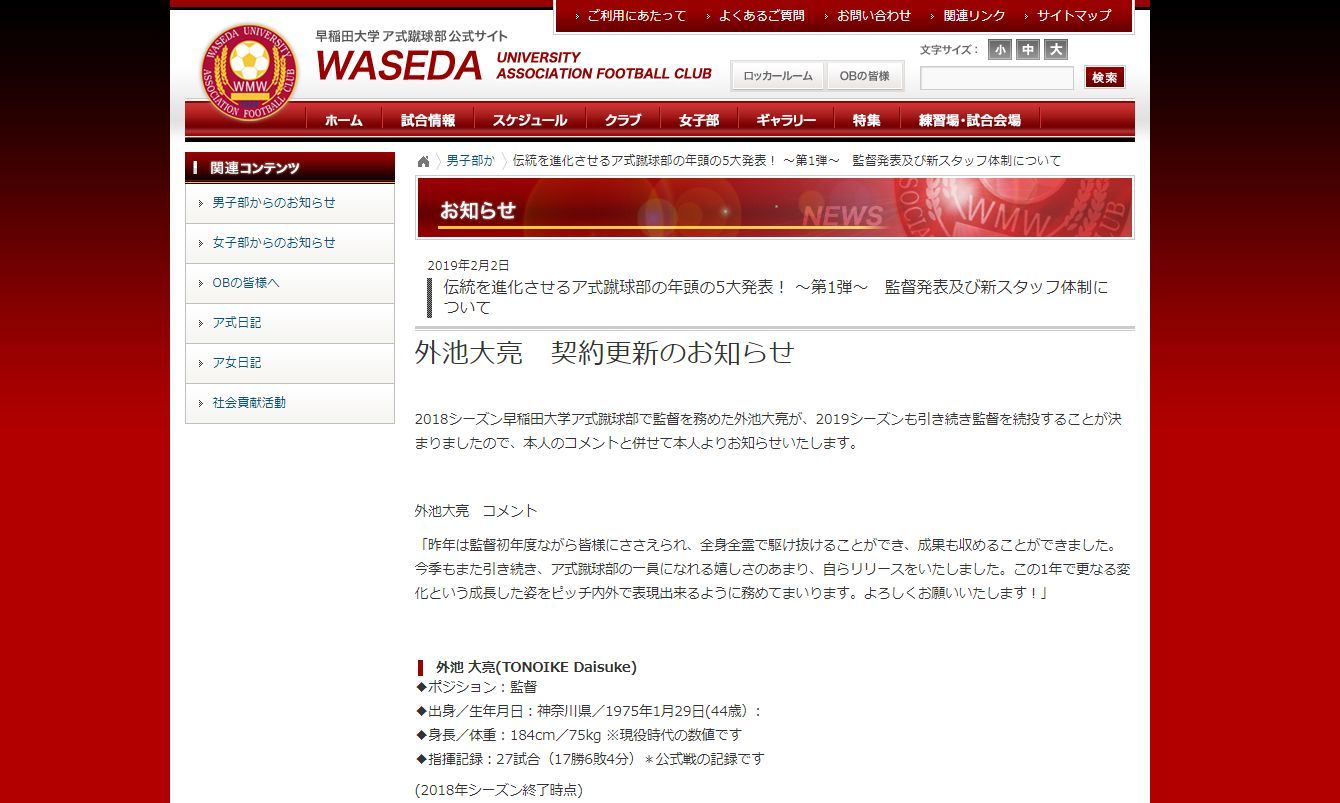 早稲田大学ア式蹴球部のウェブページより。今年2月に「外池大亮 契約更新のお知らせ」を発表。