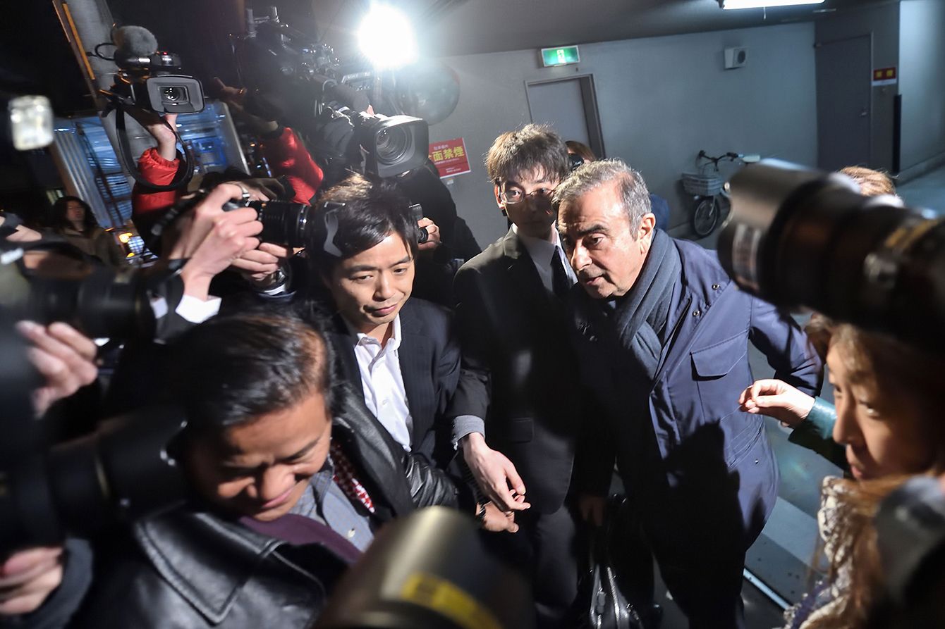 ツイッターで記者会見を予告後、弁護士事務所を出た日産自動車の前会長カルロス・ゴーン被告=4月3日、東京都千代田区(写真=AFP/時事通信フォト)