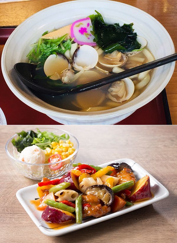 人気メニュー「はまぐりうどん」「彩り野菜と若鶏の黒酢あん」(撮影=北尾トロ、写真提供=山田食品産業)