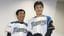 プロ野球・西武戦の試合前に、お笑いタレントの明石家さんまさん(左)と、記念撮影に納まる日本ハムの清宮幸太郎選手=2018年10月3日、札幌ドーム(
