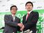 大阪ダブル選挙で当選確実となり、握手する地域政党「大阪維新の会」の松井一郎氏(左)と吉村洋文氏=2019年4月7日午後、大阪市中央区(写真=時事通信フォト)