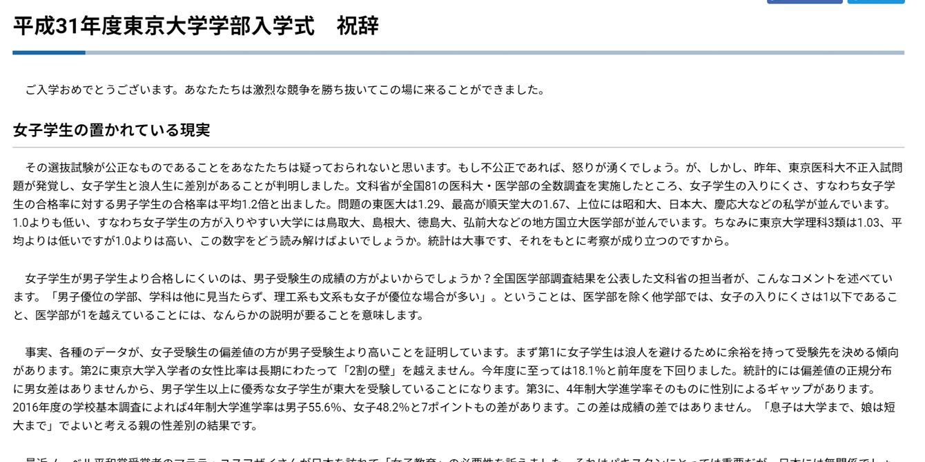 平成31年度東京大学学部入学式の上野千鶴子名誉教授による祝辞全文。東京大学ウェブページより。