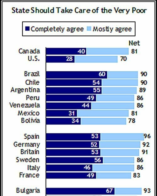 「国は貧しい人々の面倒を見るべきか」に同意する人の率は、日本は47カ国中最低だった。アメリカ・ピューリサーチセンターの調査(2007年)より。