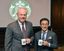 報道各社の取材に応じた米スターバックスのケビン・ジョンソン最高経営責任者(CEO、左)。右は日本法人の水口貴文CEO=2018年11月8日日、東京都中央区(写真=時事通信フォト)