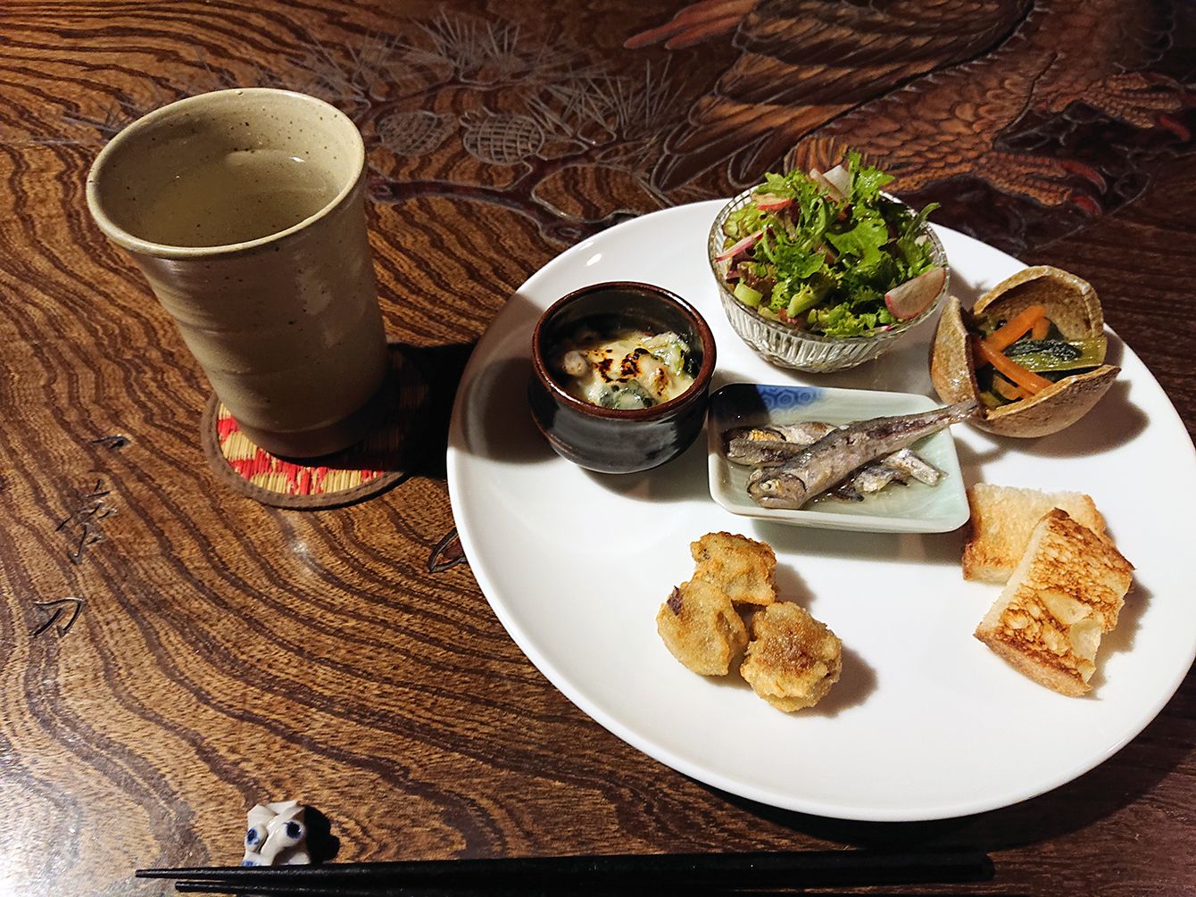 「食堂101号室」の焼酎と前菜(撮影=筒井冨美)