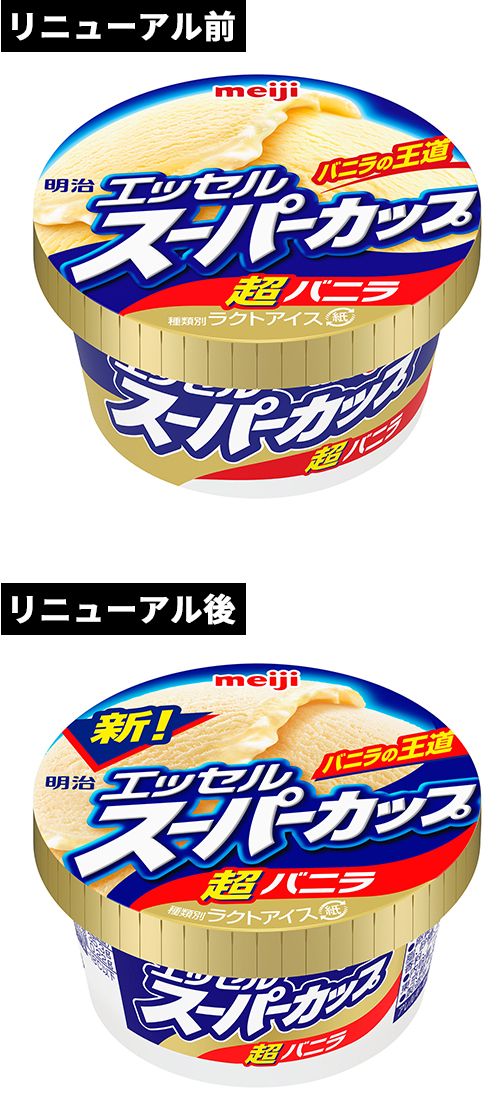 (写真上)リニューアル前の「明治 エッセルスーパーカップ」、(写真下)今年3月にリニューアルした同商品。「新!」を配し、ブルーウェーブをより強調したデザインとなっている(いずれも株式会社 明治提供)