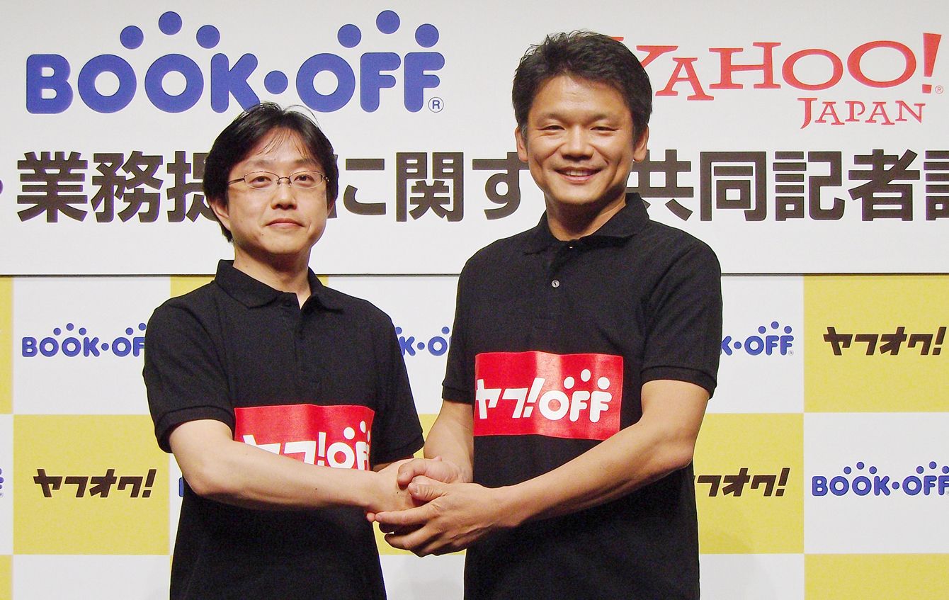 2014年4月、資本・業務提携の発表記者会見で握手するヤフーの宮坂学社長(右)と、ブックオフコーポレーションの松下展千社長(いずれも当時)。両社は2018年11月に資本提携を解消。渋谷に出したコラボ店も18年7月に閉じた。(写真=時事通信フォト)