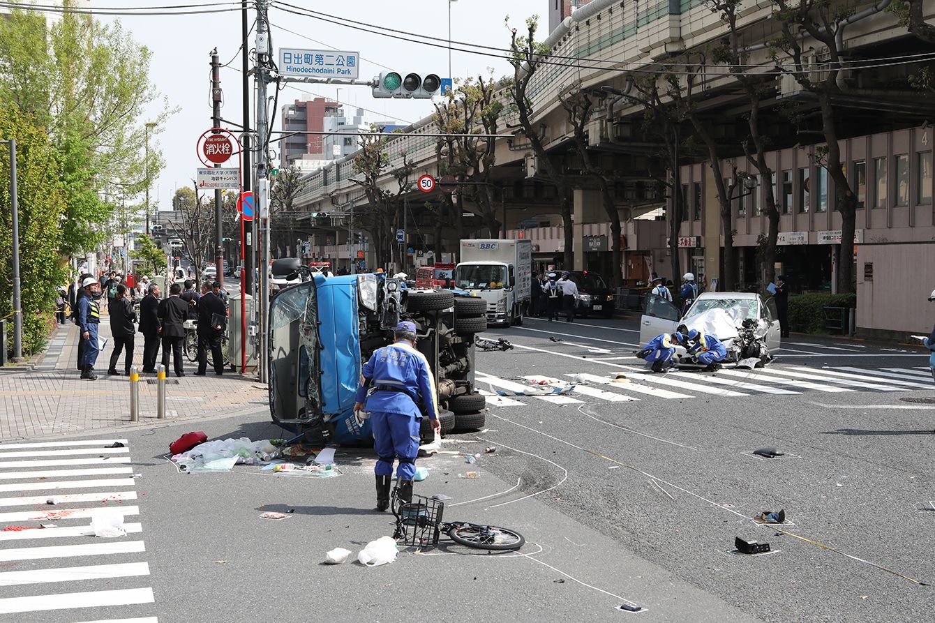2019年4月19日、東京・池袋の事故現場。乗用車(右奥)が歩行者をはねた事故現場を調べる警察官。(手前)は普通車と衝突したごみ収集車=東京都豊島区(写真=時事通信フォト)