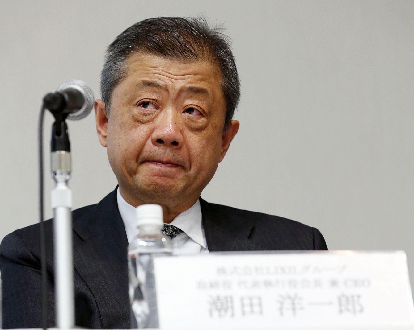 2019年4月18日、記者会見で、厳しい表情を浮かべる潮田洋一郎会長兼最高経営責任者(CEO)=東京都港区(写真=時事通信フォト)