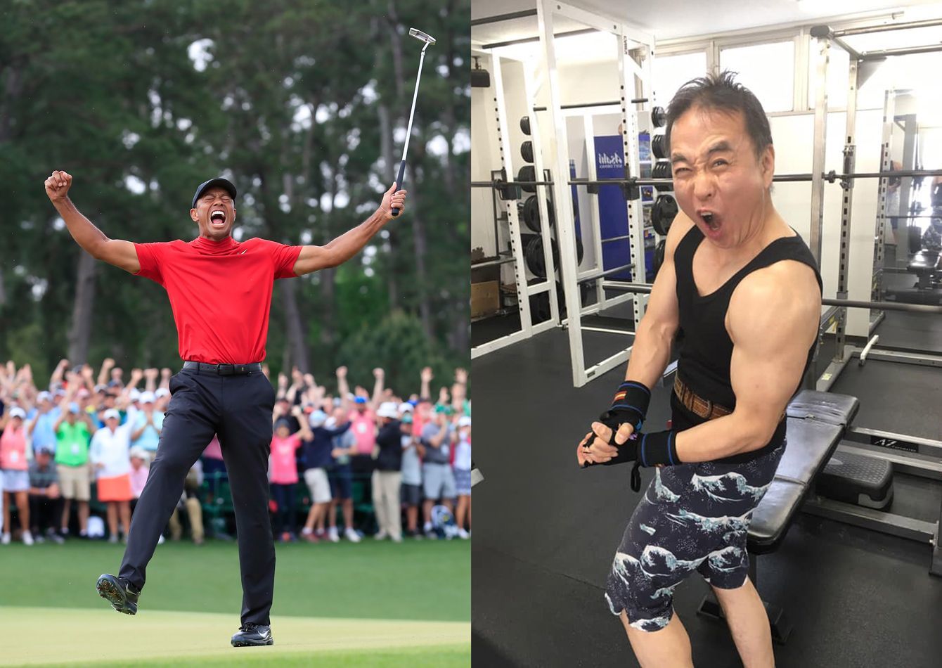 (写真左より)マスターズ・トーナメント最終ラウンドの18番、14年ぶり5度目の優勝を決めて喜ぶタイガー・ウッズ=2019年4月14日(写真=AFP/時事通信フォト)。落語家・立川談慶さん