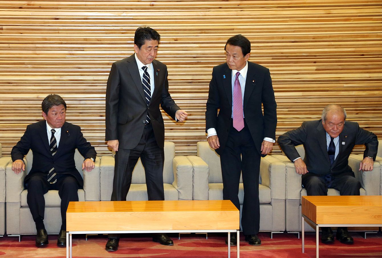 4月30日、平成最後の閣議に臨む安倍晋三首相(中央左)と麻生太郎副総理兼財務相(同右)。このあと夜9時ごろから2人だけの会談が行われた。(写真=時事通信フォト)
