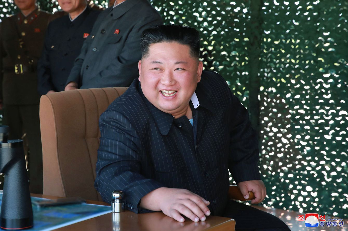 2019年5月9日、朝鮮人民軍前線・西部戦線防御部隊の火力攻撃訓練を指導する金正恩朝鮮労働党委員長(写真=朝鮮通信/時事通信フォト)