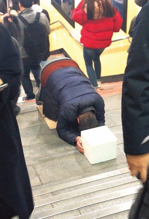 (左)韓国の駅に掲げられる「将兵よ! 職(JOB)を摑め」と書かれた看板。(右)街には、疲れ果てた若者の姿が多い。
