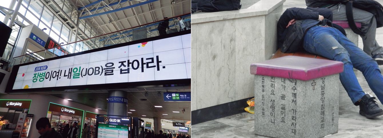 (左)韓国の駅に掲げられる「将兵よ! 職(JOB)を摑め」と書かれた看板。(右)街には、疲れ果てた若者の姿が多い。