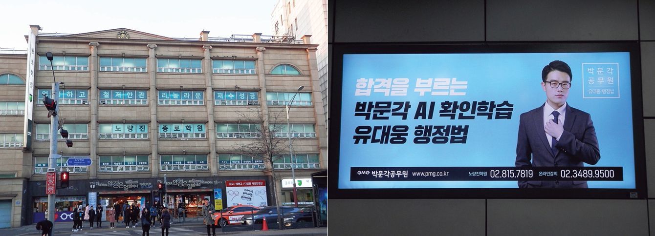 老舗の就業学院(左)と、就業学院の看板(右)。韓国では就業学院に通って就職するのが一般的。中には10年通う人も。