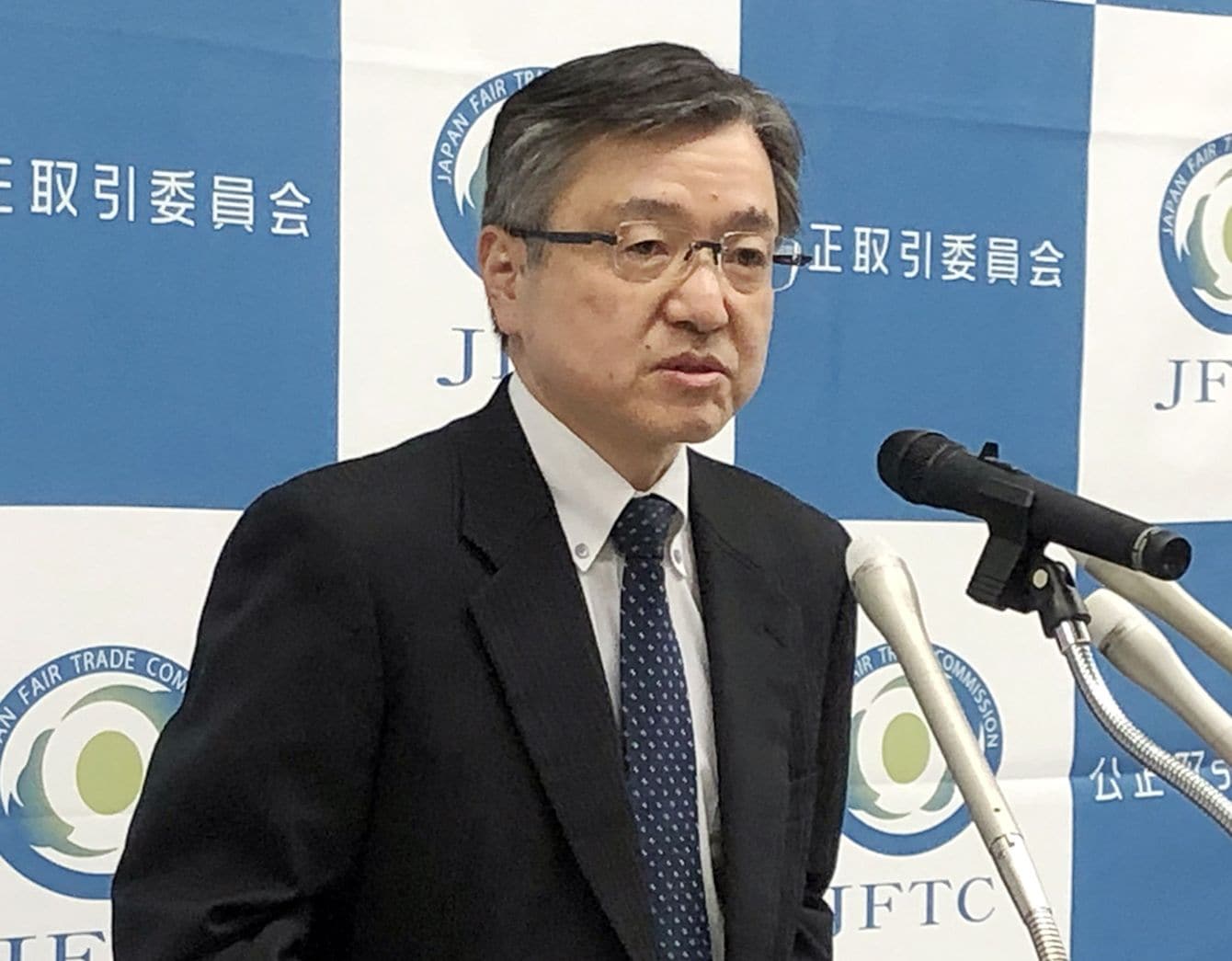 2019年1月22日、記者会見でプラットフォーマーの取引実態調査について説明する公正取引委員会の山田昭典事務総長(写真=時事通信フォト)