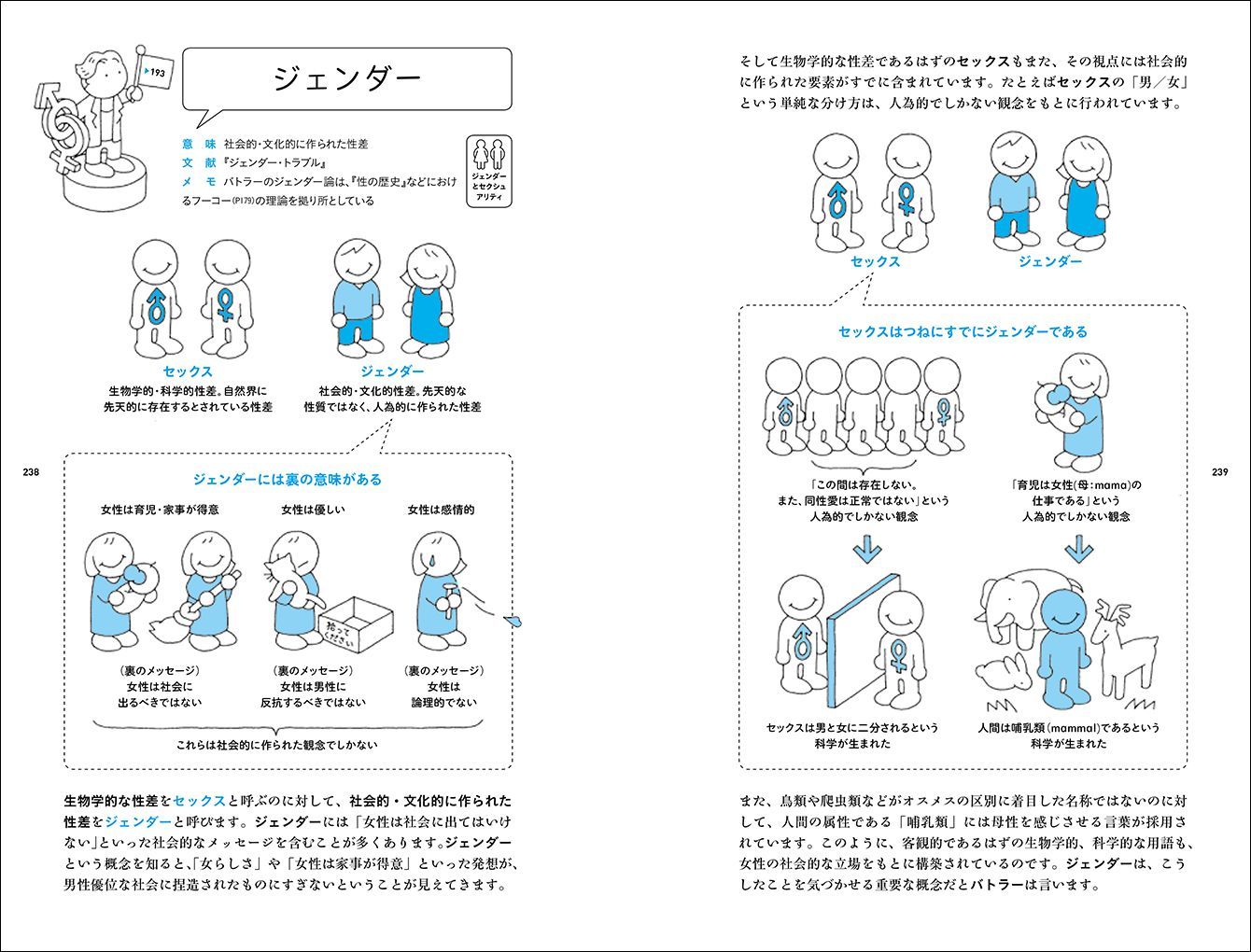 社会学者のジュディス・バトラーは「セックスはつねにジェンダーである」と言っています。この場合のセックスは「生物学的・科学的性差」、ジェンダーは「人為的性差」を表します。その意味するところを『