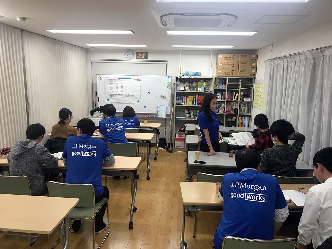 JPモルガンのプロボノの様子。経済的に苦しい家庭の高校生の学習支援をする