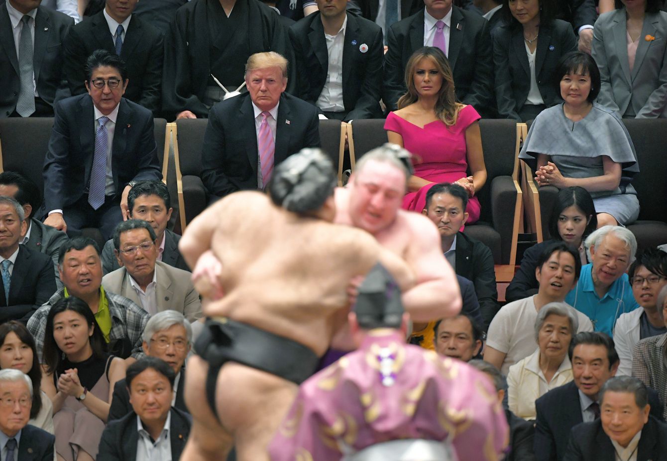 大相撲夏場所千秋楽の栃ノ心と高安戦を升席で観戦する、(奥左から)安倍晋三首相、トランプ米大統領、メラニア夫人、安倍昭恵夫人=2019年5月26日、東京・両国国技館(写真=時事通信フォト)