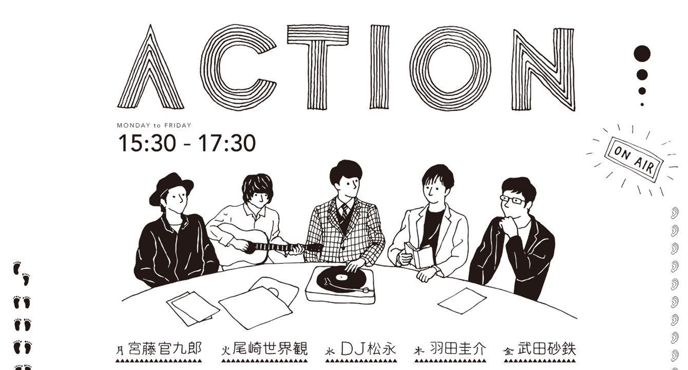 「荒川強啓デイ・キャッチ!」の後継として4月1日から始まった新番組「ACTION」(毎週月~金15:30~17:30)。パーソナリティーは月曜から順に、脚本家の宮藤官九郎、クリープハイプの尾崎世界観、Creepy NutsのDJ松永、作家の羽田圭介、ライターの武田砂鉄の各氏。(画像=