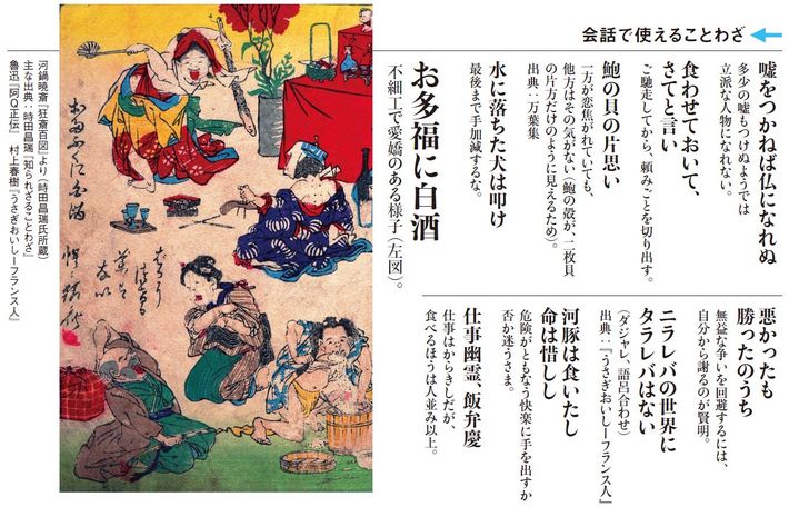奇才・河鍋暁斎『狂斎百図』の一部(写真、時田氏蔵)。妖怪と町人が入り乱れ、そこにことわざを添えたユーモラスな戯画集だ。1863(文久3)年~66(慶應2)年にかけてシリーズ刊行され、人気を呼んだ。