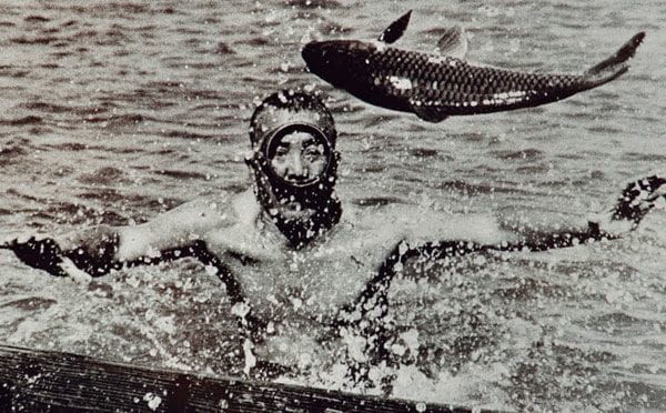 「鯉取りまあしゃん」こと上村政雄氏(1913~99年)。福岡県久留米市の素潜り漁の達人。火野葦平の小説『百年の鯉』のモデルとされている。
