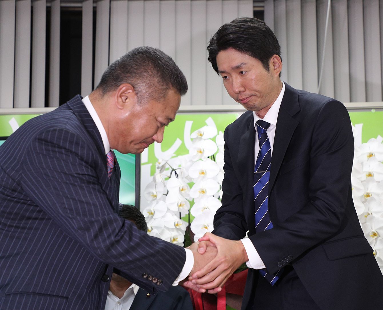 堺市長選挙で当選確実となり、日本維新の会の馬場伸幸幹事長(左)と握手する永藤英機氏=2019年6月9日、堺市堺区(写真=時事通信フォト)