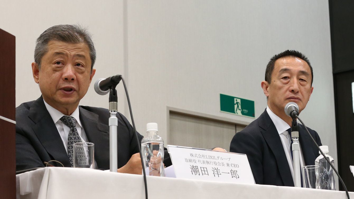 記者会見で、辞任の意向を表明したLIXILの潮田洋一郎会長兼最高経営責任者(CEO)(左)と山梨広一社長兼CEO=2019年4月18日、東京都港区(写真=時事通信フォト)
