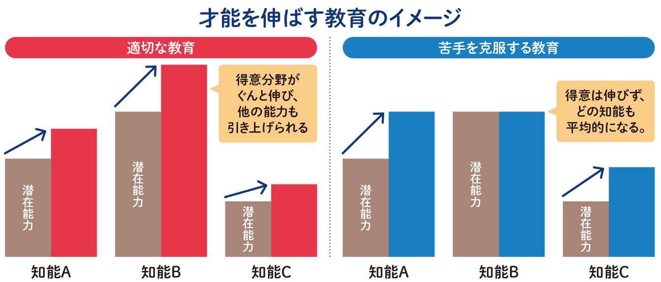 従来の「苦手を克服する教育」では得意な分野は伸びにくいが、8つの知能を意識した「適切な教育」であれば得意分野も、他の分野も伸びる。「