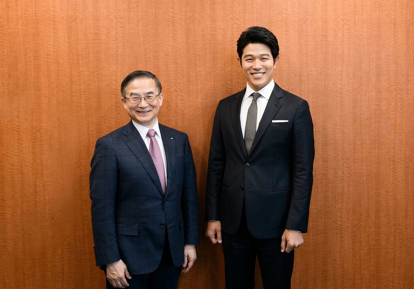 イーオン社長の三宅義和氏(左)と俳優の鈴木亮平氏。スーツ32万5000円~、シャツ5万4000円~(ともにオーダー価格・税抜き)、ネクタイ〔参考商品〕以上すべてジョルジオ アルマーニ(ジョルジオ アルマーニ ジャパン)