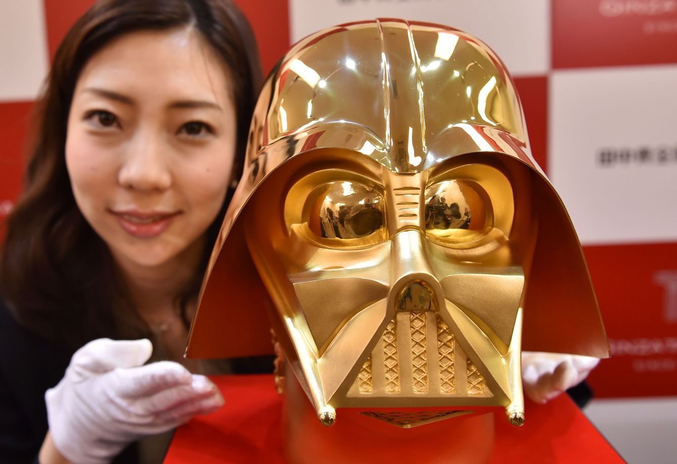 貴金属ジュエリーの「GINZA TANAKA」が2017年に発売した純金製の「ダース・ベイダーライフサイズマスク」。幅約26.5センチ、高さ30センチで税込み価格は1億5400万円。(写真=AFP/時事通信フォト)