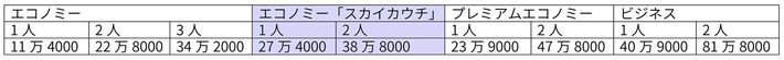 *通常期に往復エコノミー「スカイカウチ」を利用した場合、全クラスの比較