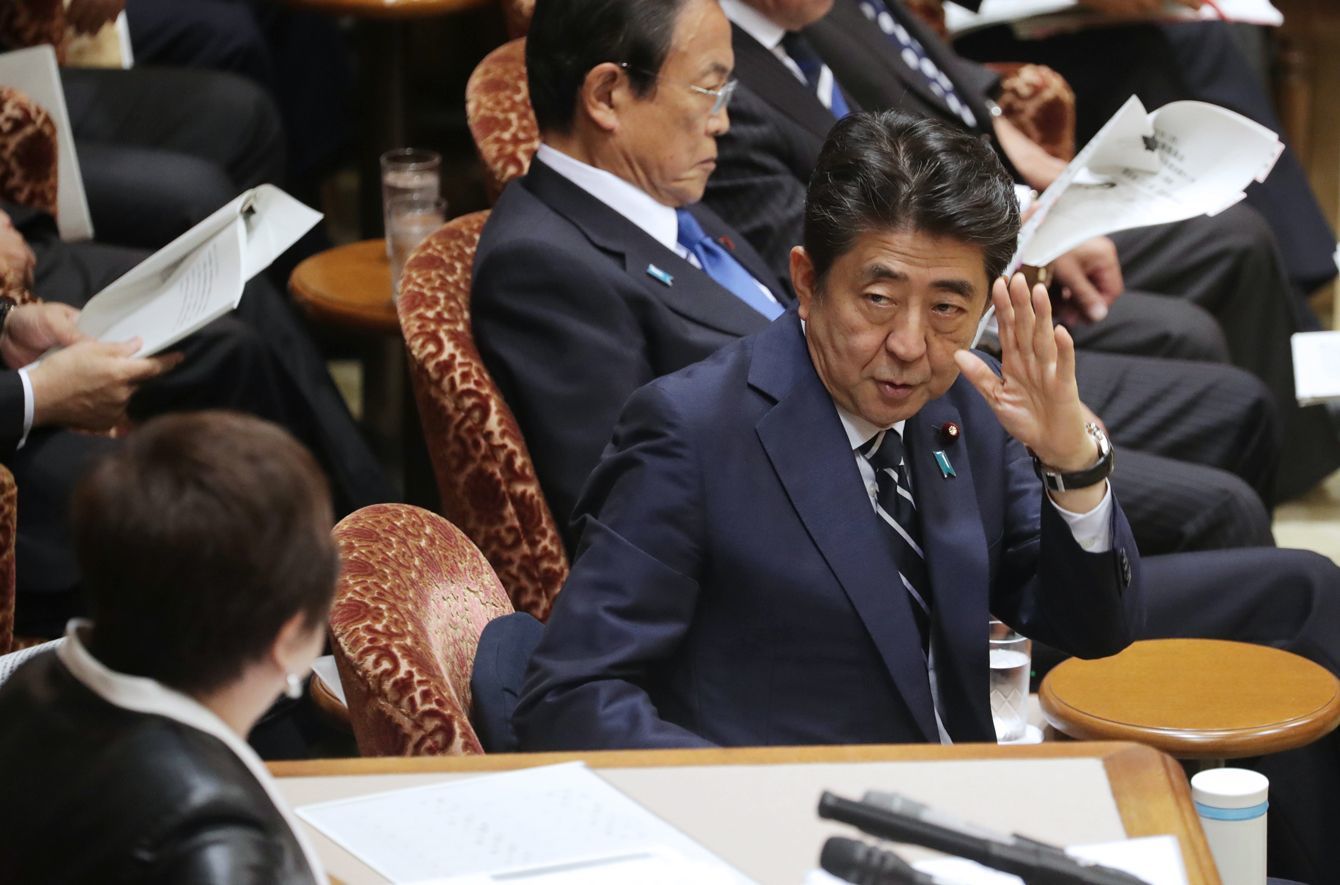 参院決算委員会で、挙手する安倍晋三首相(右)=6月10日、国会内(写真=時事通信フォト)