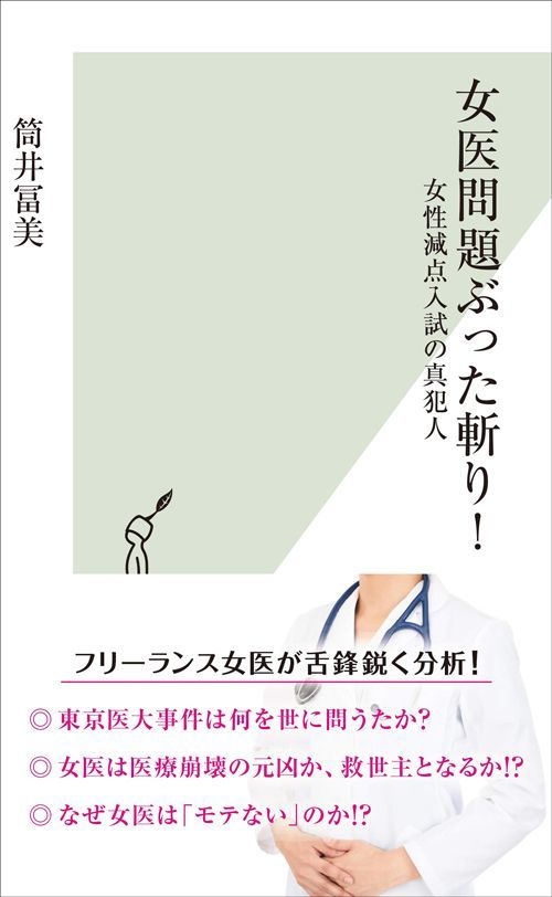 昨今の女医問題を筆者が考察した新刊。筒井冨美『女医問題ぶった斬り! 女性減点入試の真犯人』(光文社新書)