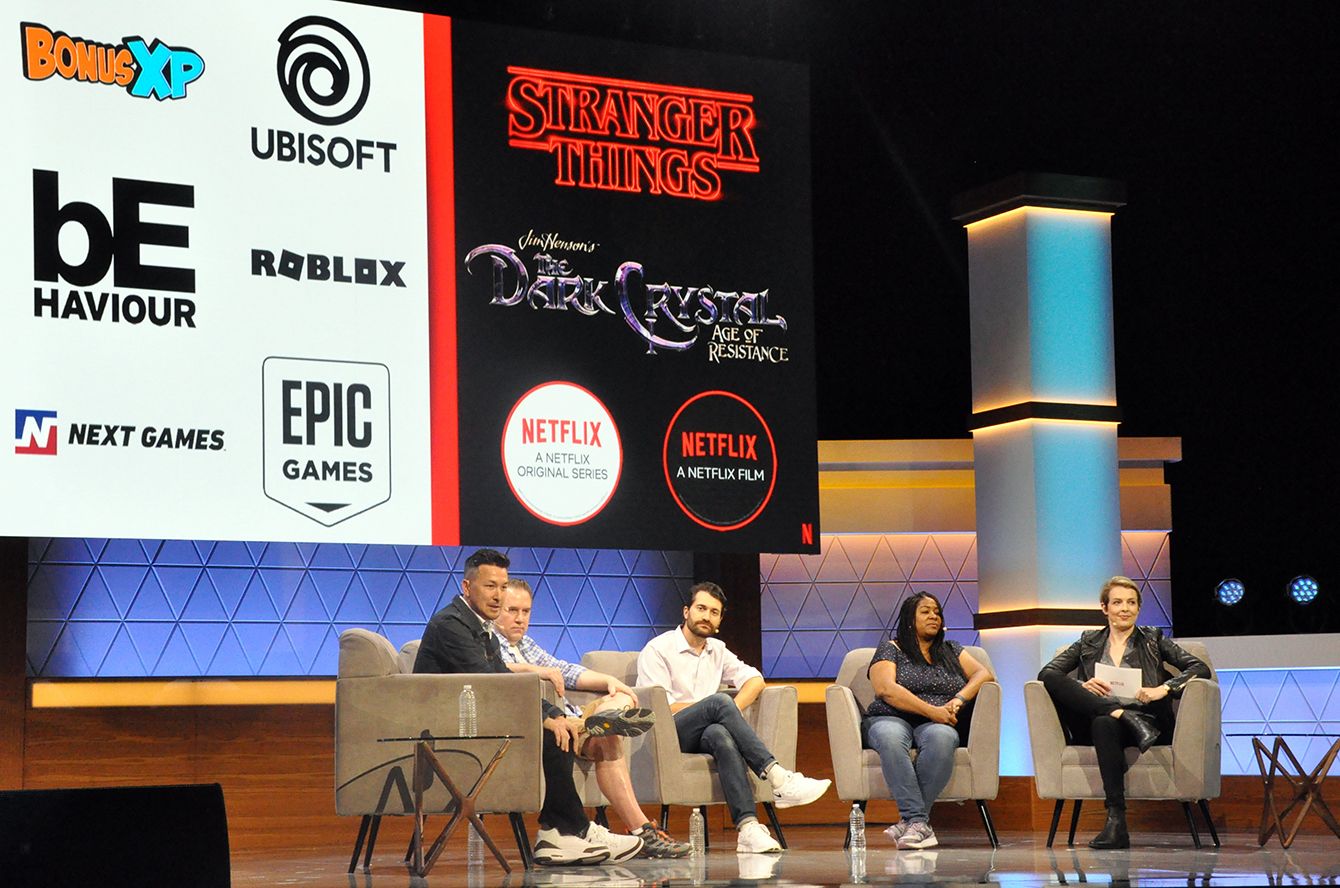 ゲーム見本市「E3」のイベントで、オリジナル動画に基づくゲーム製作の取り組みを説明する動画配信大手ネットフリックスの担当幹部ら=2019年6月12日、アメリカ・ロサンゼルス(写真=時事通信フォト)