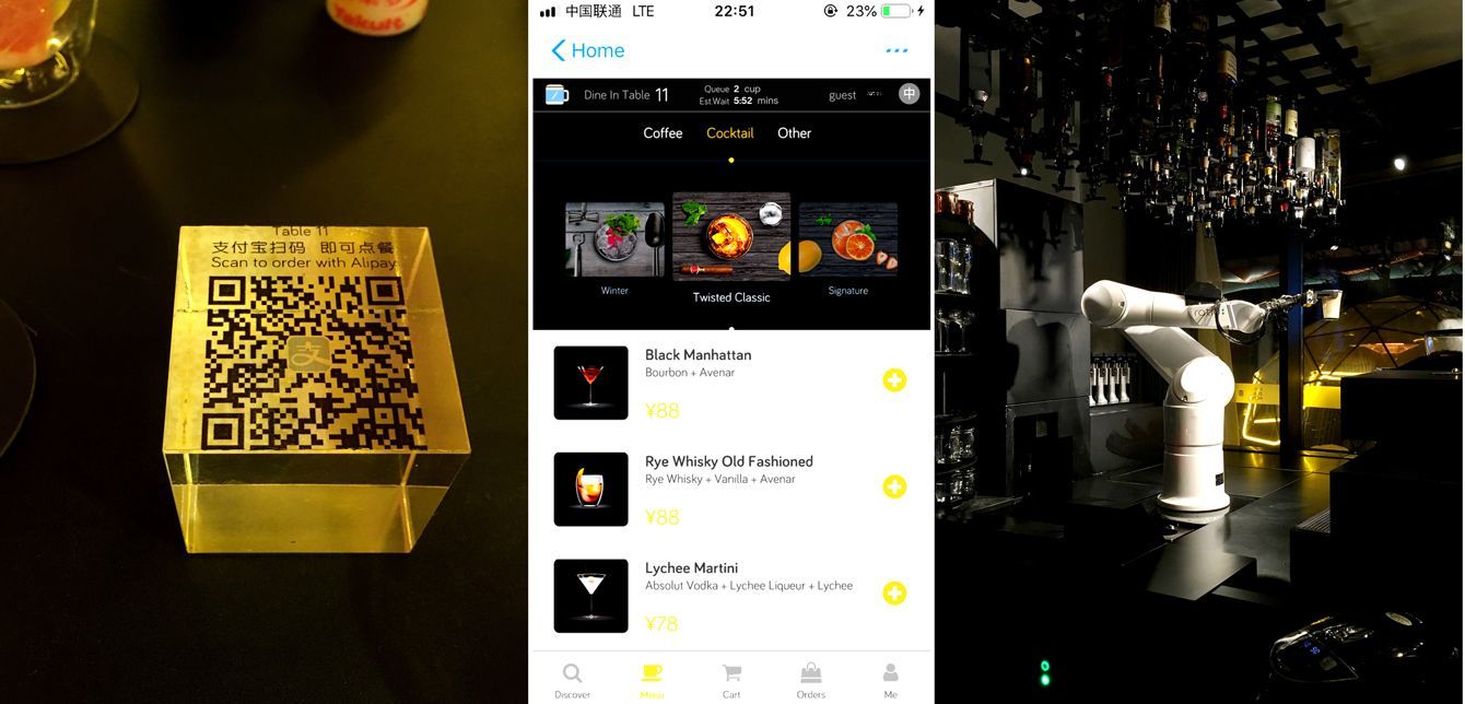 (左)バーのテーブルにあるQRコード。(中央)飲み物の注文画面。リキュールの濃さも細かく調節できる。(右)客のスマホからの注文を受けて作り出すバーテンロボット。