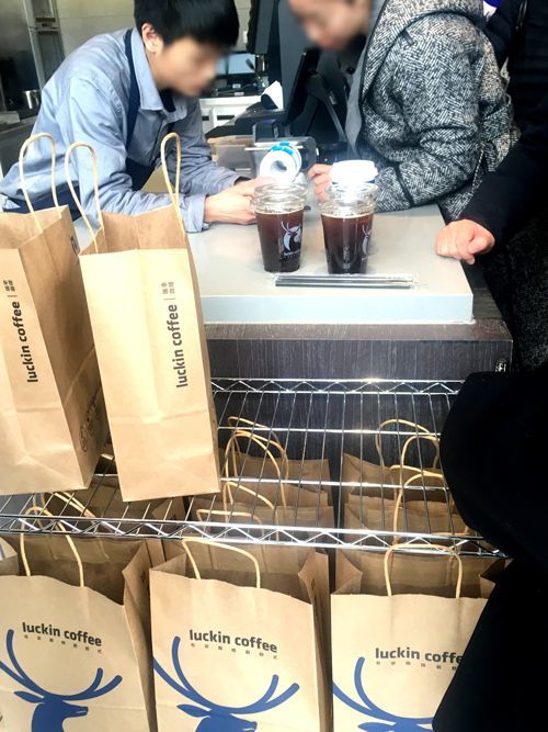 luckin coffeeのレジ前。ピックアップ待ちの商品が並ぶ。