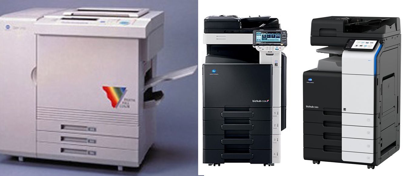 (左)デジタルカラー複合機の第1号機(ミノルタ時代)CF70。(中央)2010年代の欧州コニカミノルタの躍進を支えたデジタルカラー複合機のbizhubシリーズ、そのデザインのベースとなったC353。(右)最新鋭機のbizhub C360i(写真提供=コニカミノルタ)