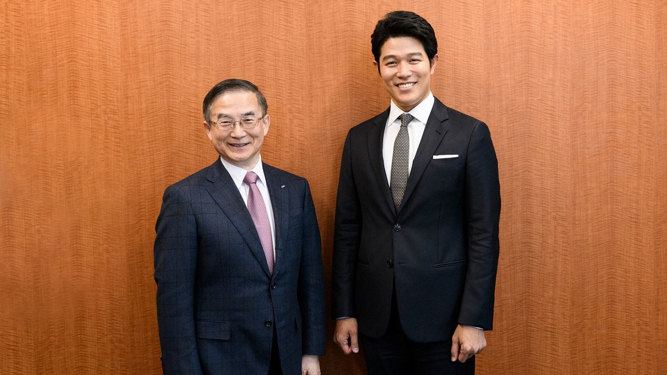 イーオン社長の三宅義和氏(左)と俳優の鈴木亮平氏。スーツ32万5000円~、シャツ5万4000円~(ともにオーダー価格・税抜き)、ネクタイ〔参考商品〕以上すべてジョルジオ アルマーニ(ジョルジオ アルマーニ ジャパン)