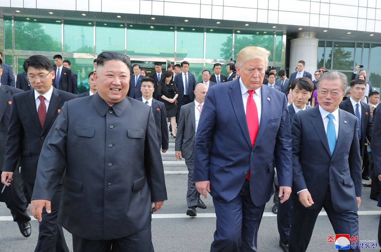 6月30日、板門店で並んで歩く(左から)金正恩朝鮮労働党委員長と米国のトランプ大統領、韓国の文在寅大統領。(写真=朝鮮通信/時事通信フォト)